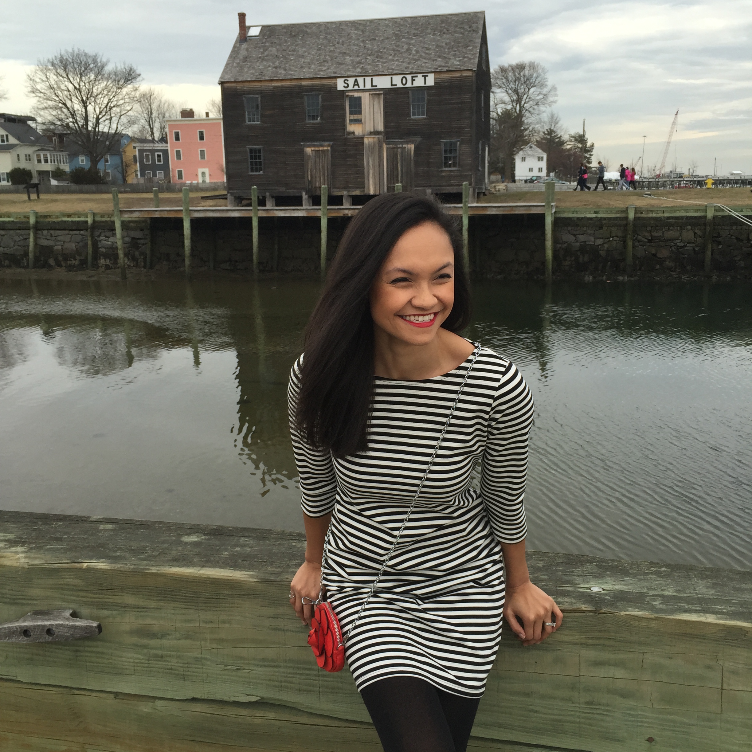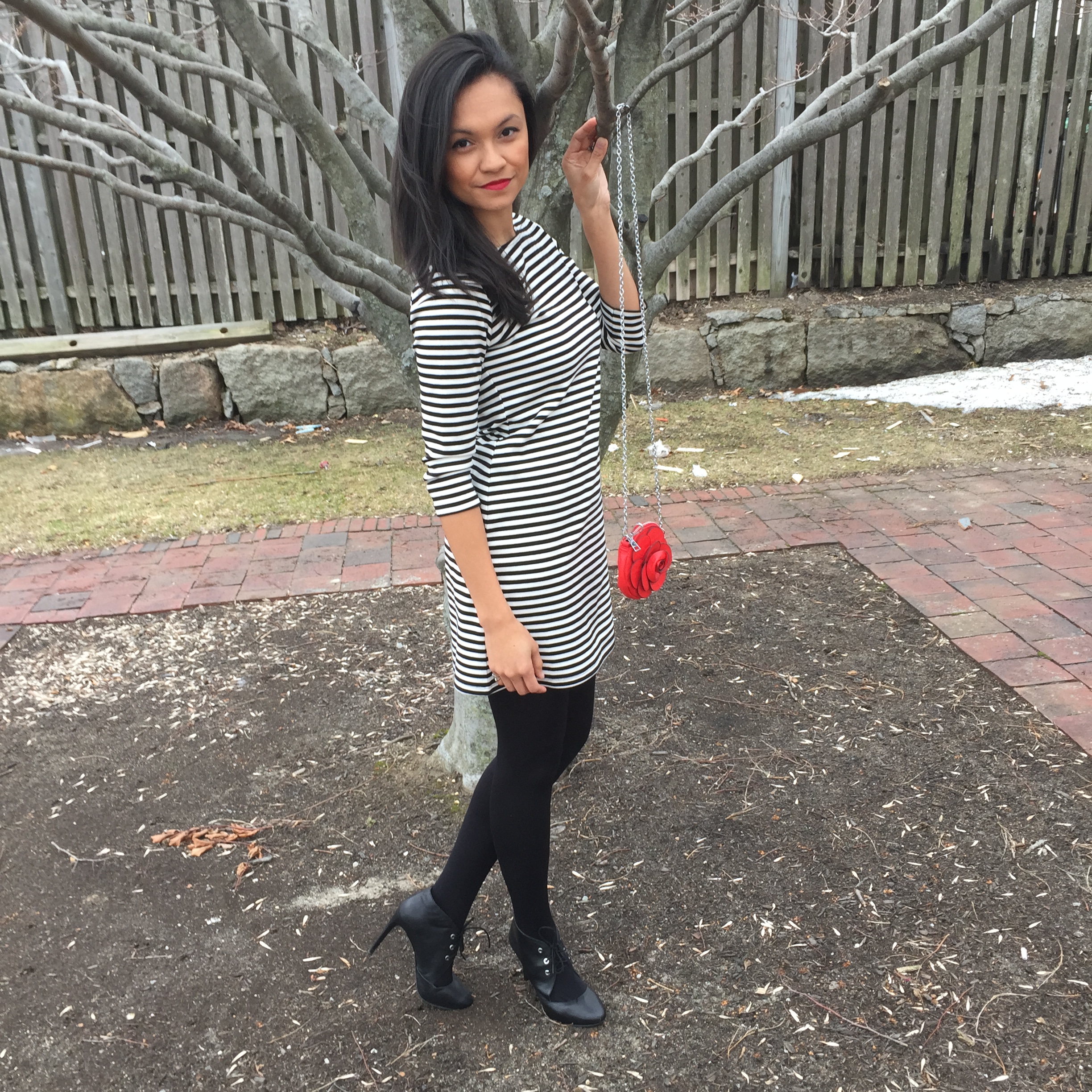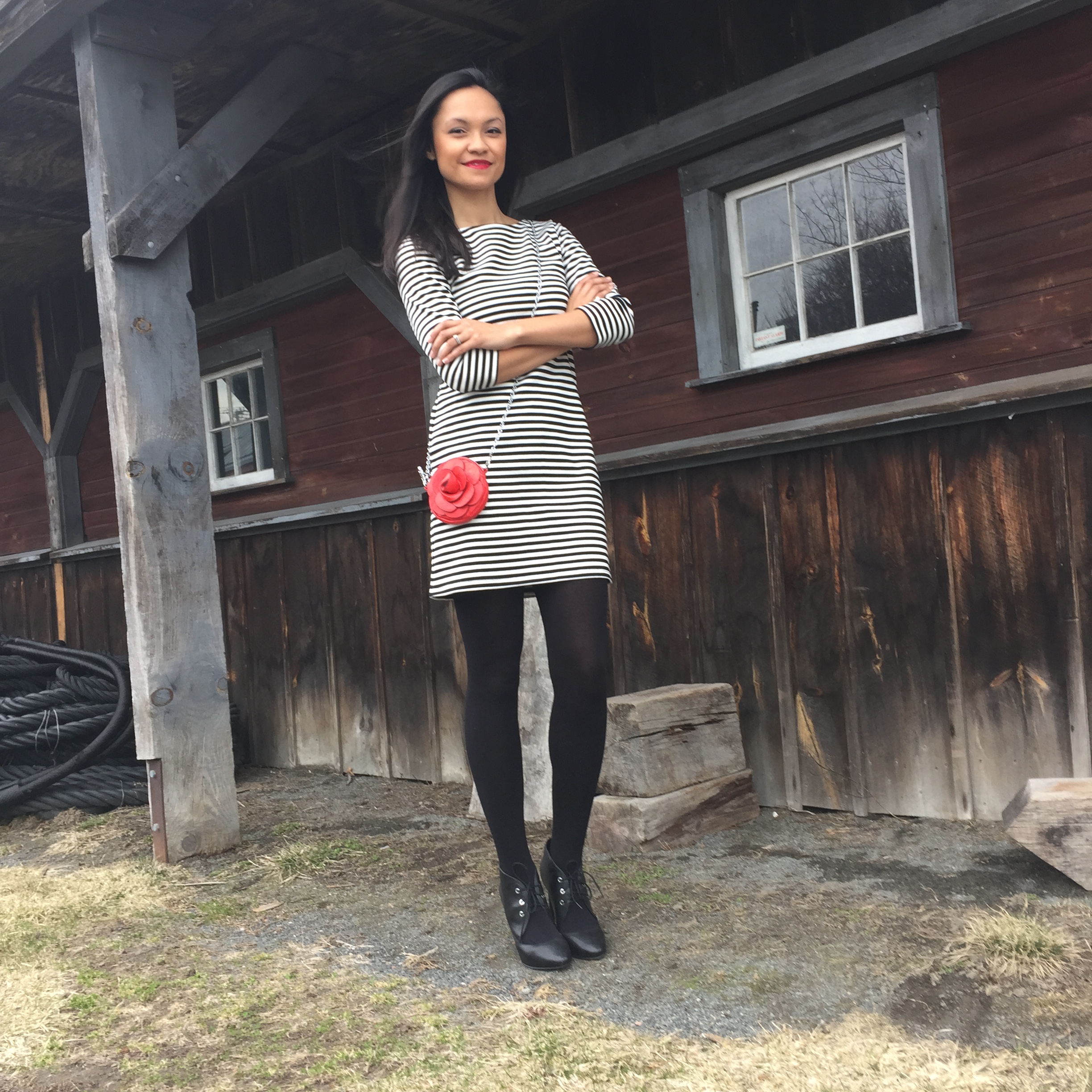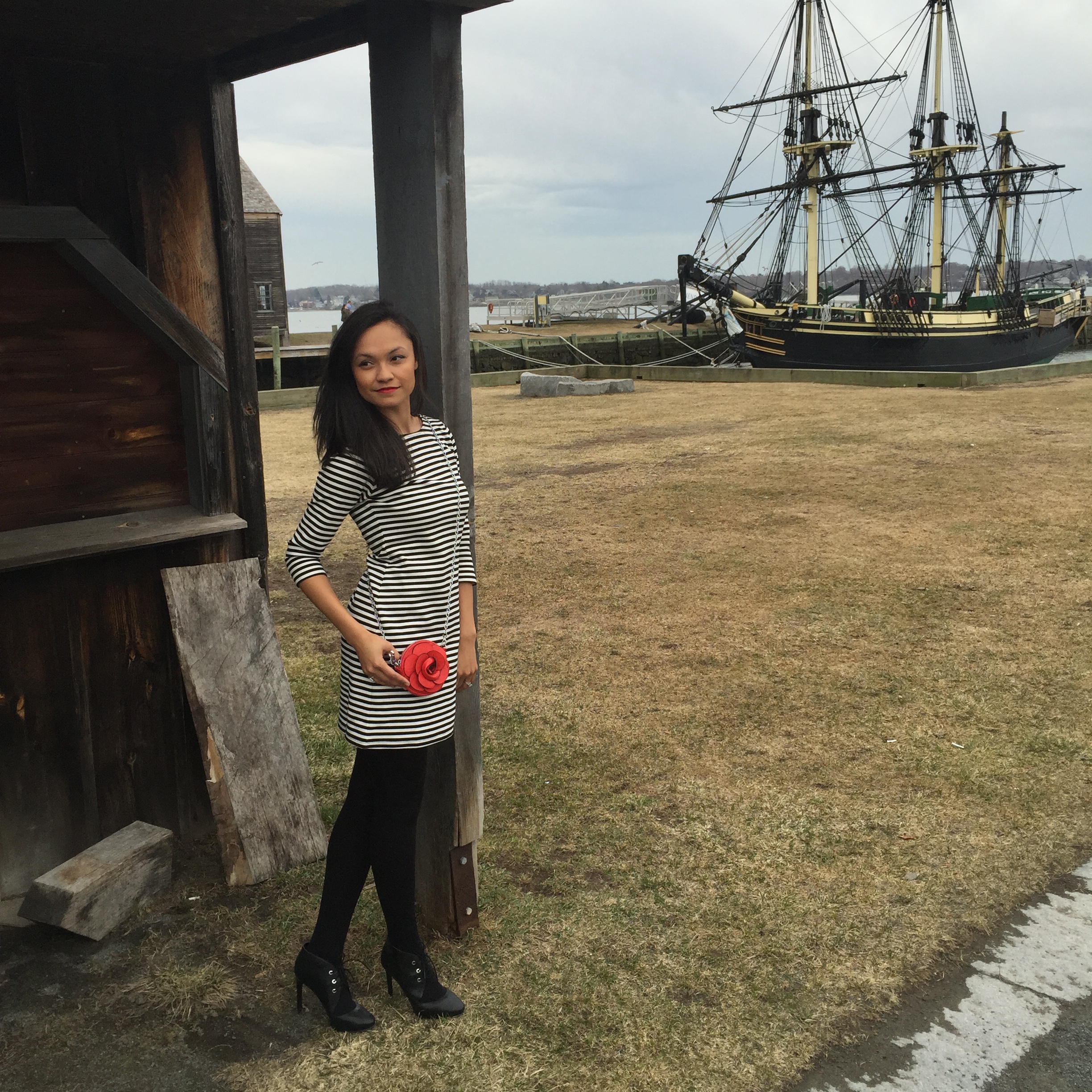 While here, the sunshine was out but a little windy for a spring evening.  I wore a very comfortable black and white striped dress with 3/4 sleeves, fleece lined black tights (because I am always cold), and black leather booties to dinner.  It was perfect for walking around the town with my better half and popping our heads into the little boutiques along Pickering Wharf.