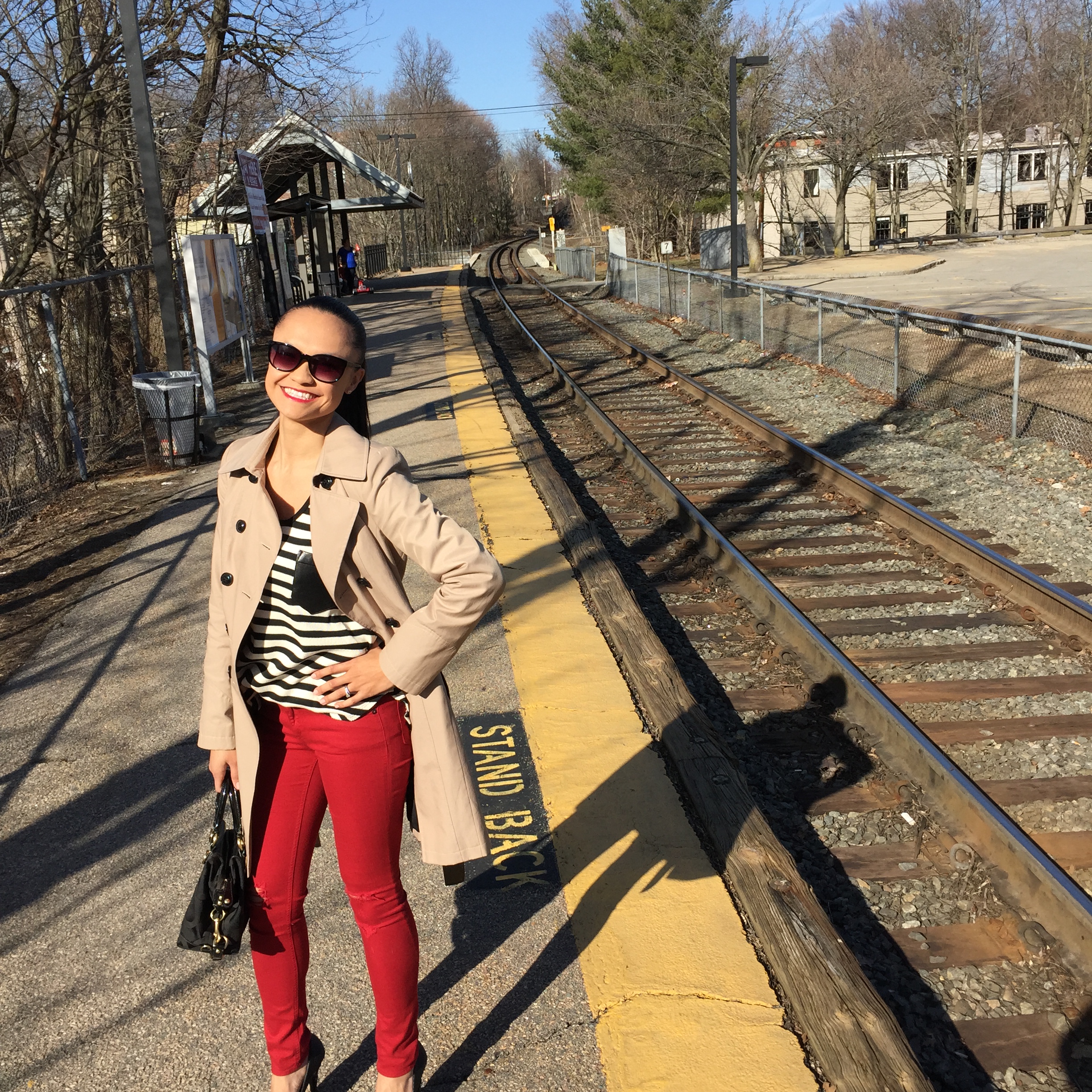 As I stated in previous posts – I tend to stick to the same styles as well as colors of clothing. This is the first time that I have worn colored pants and RED was such a fun choice. I’m totally hooked and now I want all different colors. I paired the pants with a black and white striped long sleeve shirt adorned with a leather pocket and finished with a trench coat, fitting for the celebration.