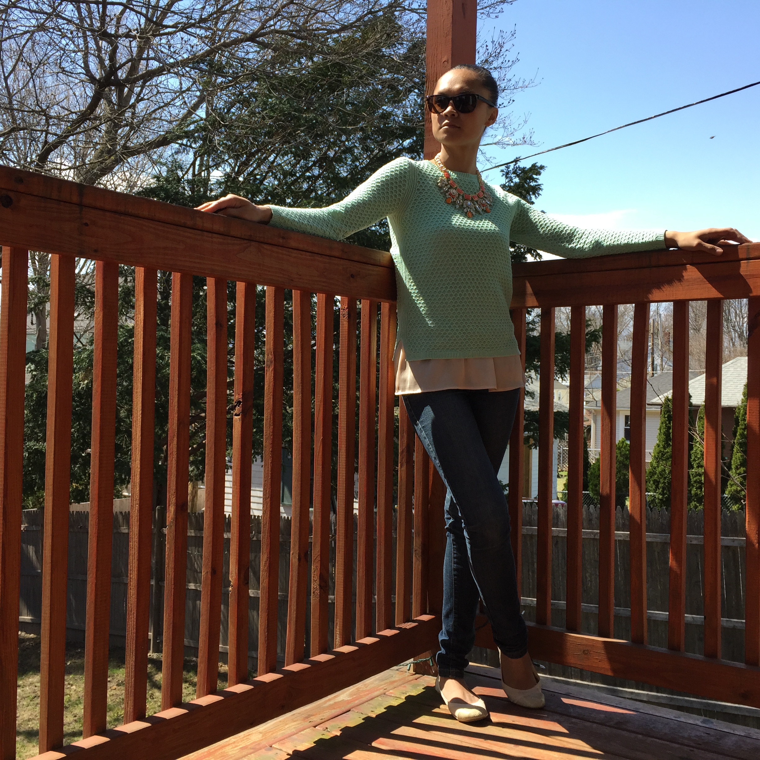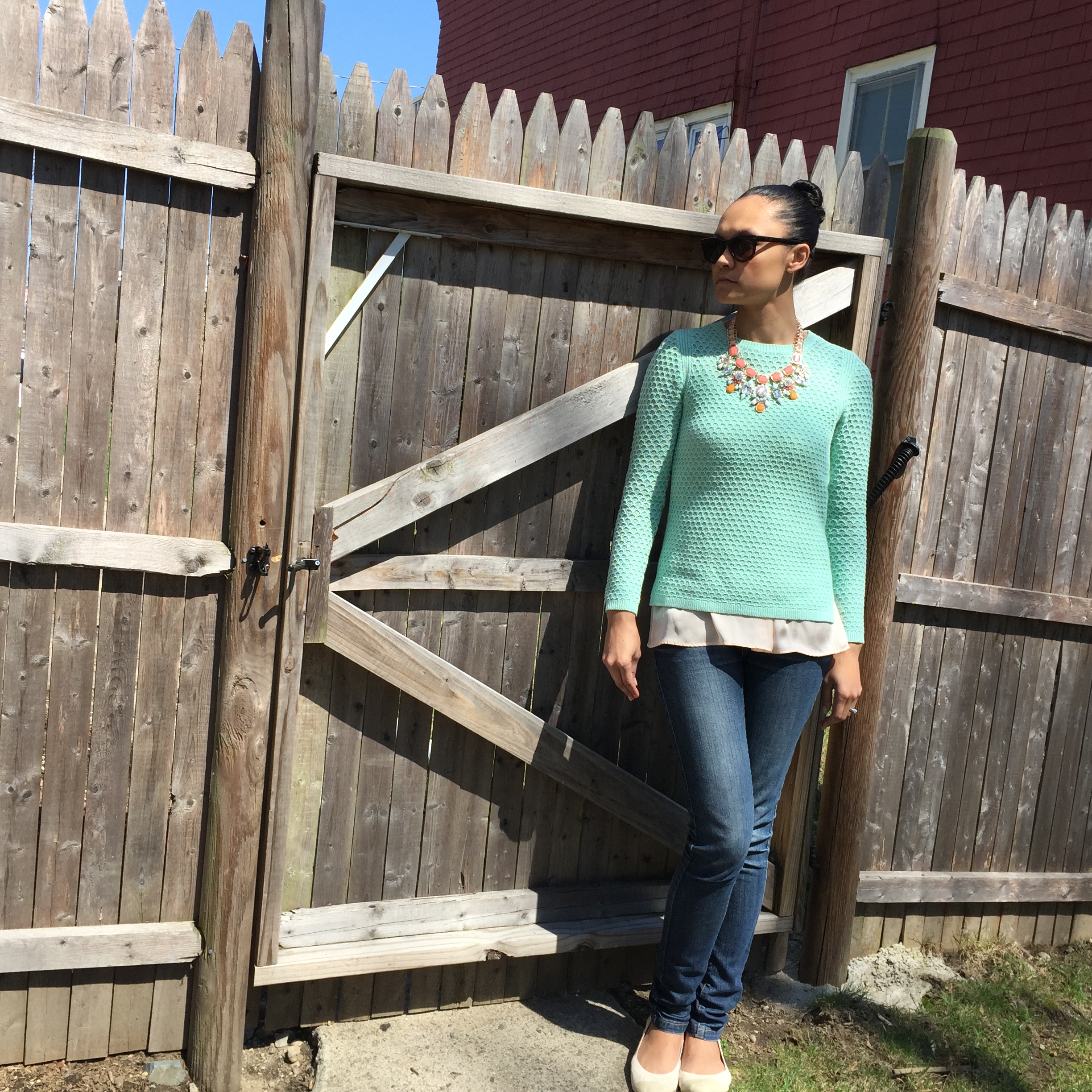 This past weekend, I had some friends visiting from back home and this ensemble was perfect for lunch. With the multiple light layers, I didn’t need any outerwear for walking around outdoors. I decided to pair a blush pink satin blouse with a mint green honeycomb knit sweater. I love the extra layer, the texture and pop of color that is fitting for the season. Cream colored ballet flats and a spring statement necklace finished the complete look.