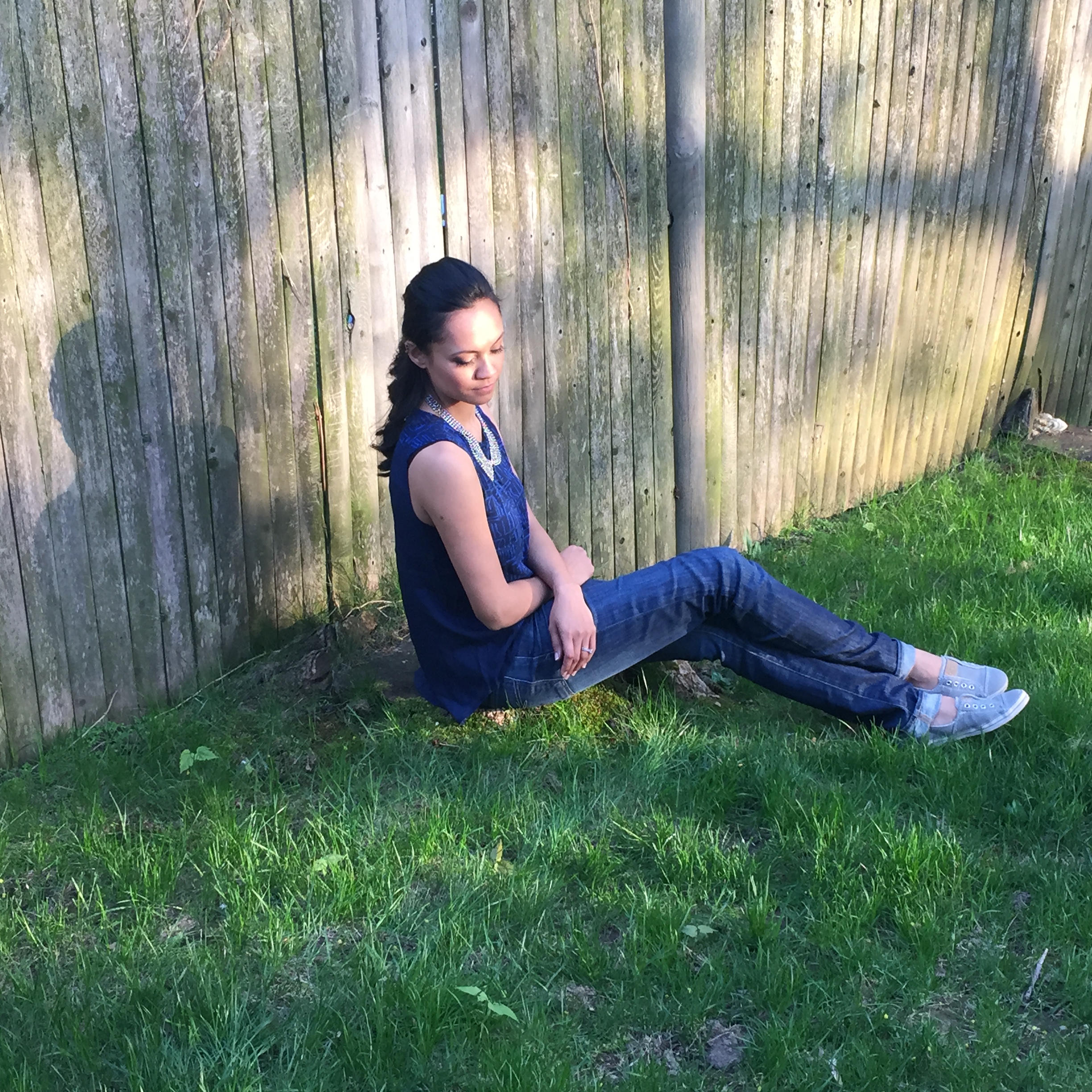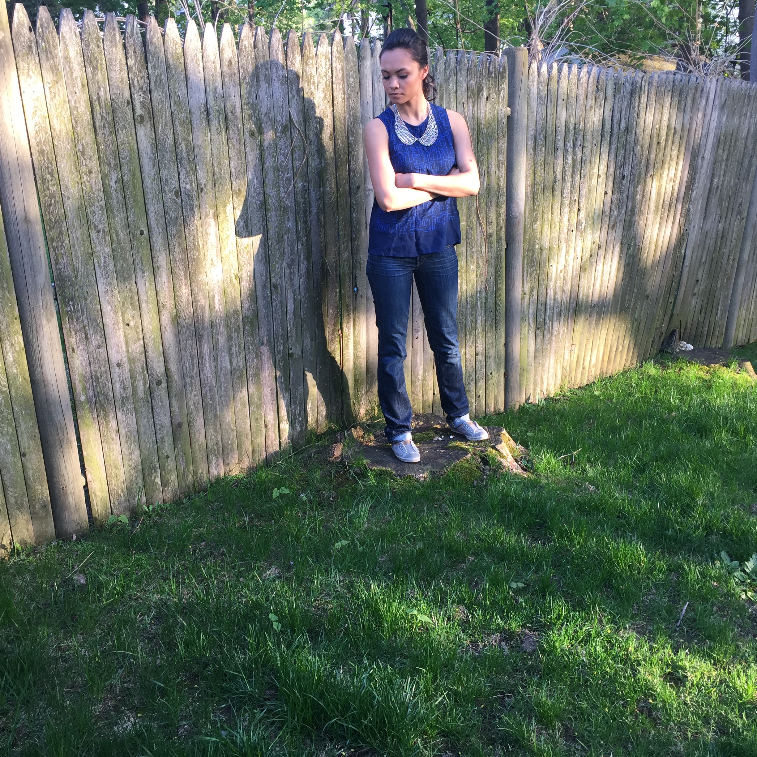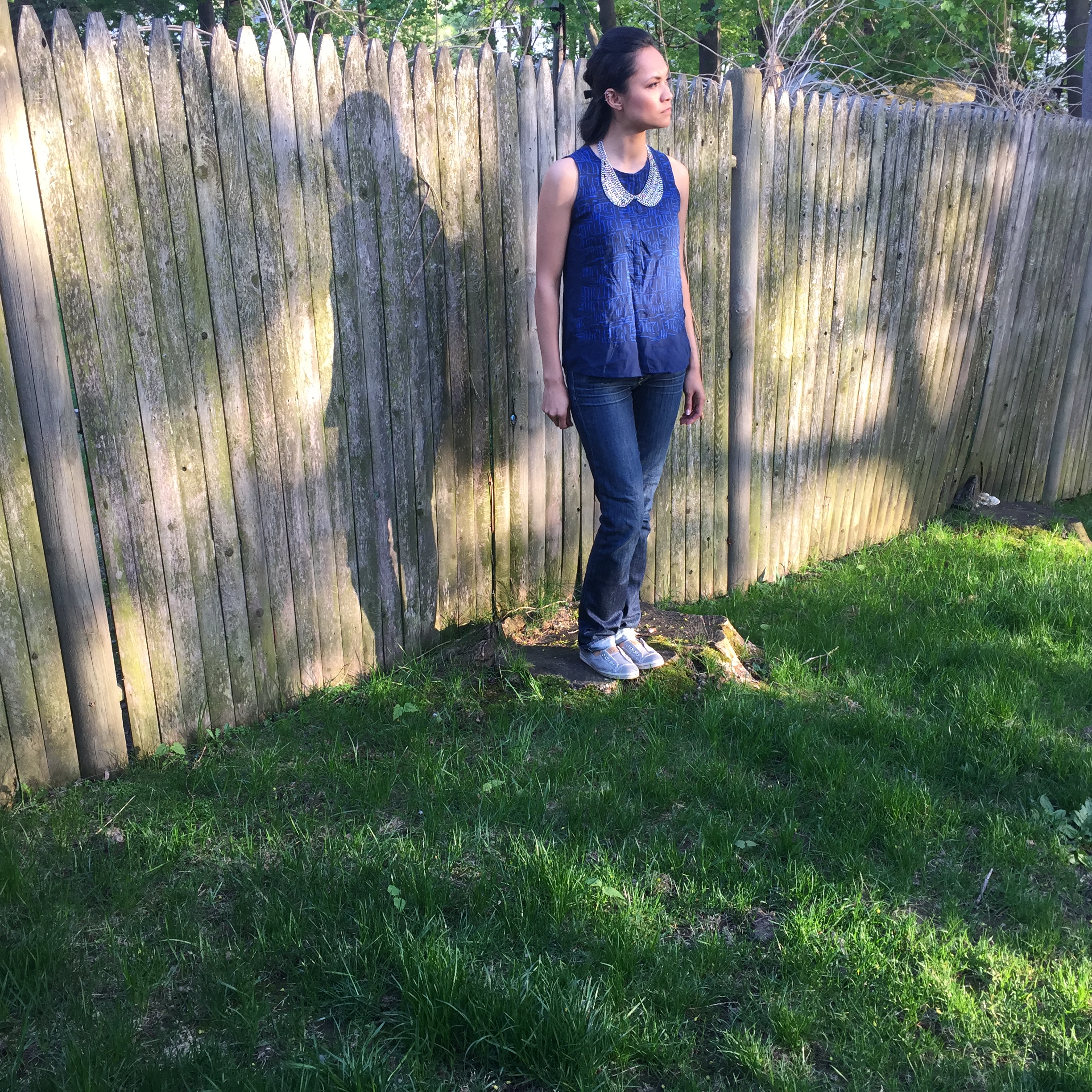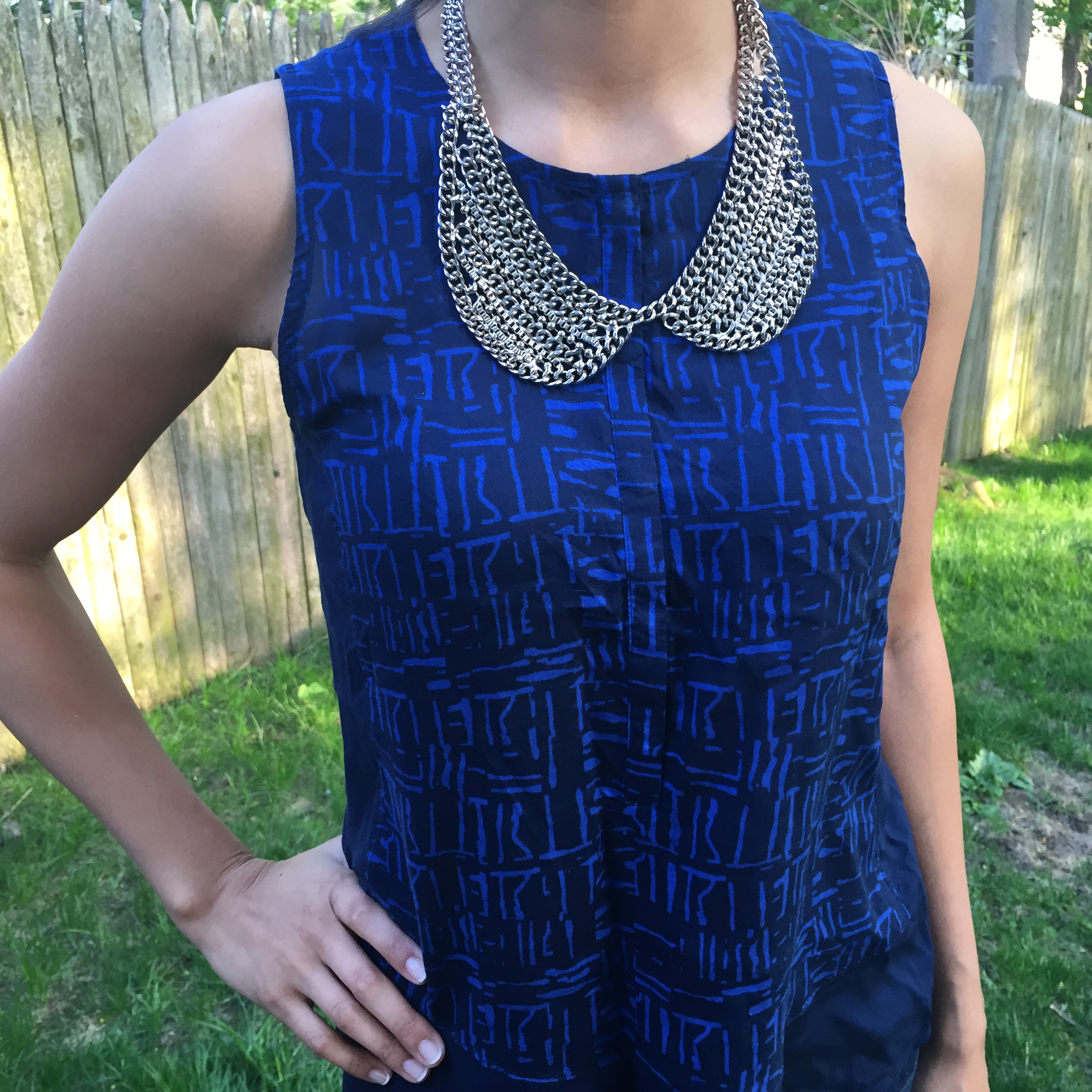 The graphic print on this shirt is so fun and really makes the nighttime blue color POP! I added a mixed metal collar necklace and I think it goes well. A little primp and punk at the same time – LOVE 🙂